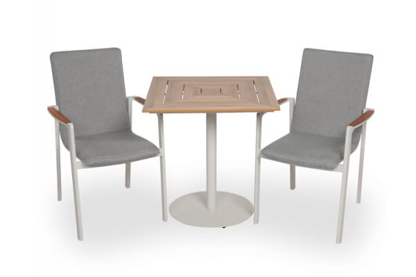 Skab din egen lille udeoase med et cafésæt, der gør det nemt at nyde både morgenkaffen og de lange, lyse aftener. Lene cafébordet kombinerer et let, hvidt aluminiumsstel med en flot nonwood-bordplade, der giver et indbydende look. 100% Vedligeholdelsesfri