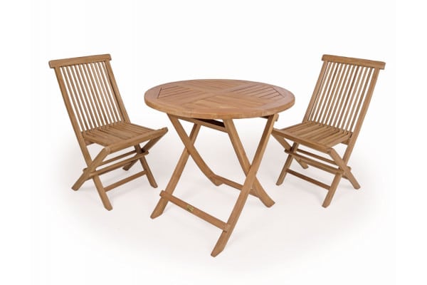 Teak Cafesæt i kvalitets kerneteak. Et perfekt sæt til altanen da både bord og stole kan slåes sammen.